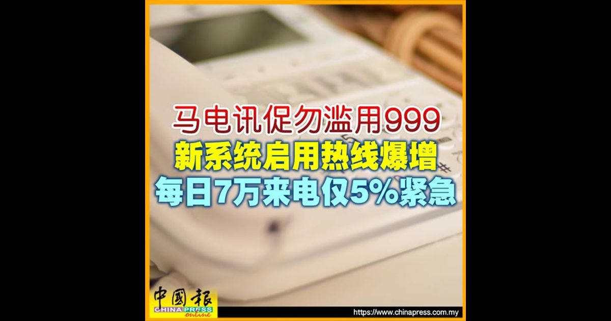 (吉隆坡20日讯)“新一代大马紧急服务”系统(NG MERS 999)自11月16日启用后,这个供民众紧急求助拨打的热线每日来电量,从以往的5万通激增至将近7万通,但只有大约5%是确实需紧急援助的求救电话,因此外界受促切勿滥用这个求救热线。