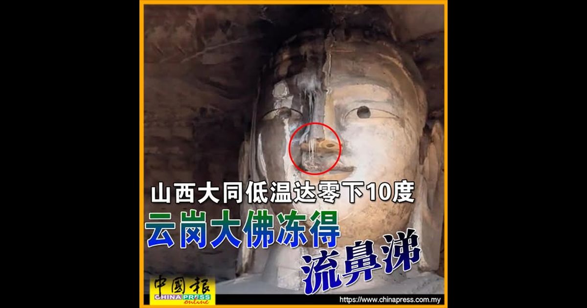 (北京21日综合电)中国山西大同近日气温骤降至零下10度,云冈石窟一尊大佛的鼻梁与眉骨处出现长条冰凌,宛如佛像被冻得“流鼻涕”,引起民众热议。