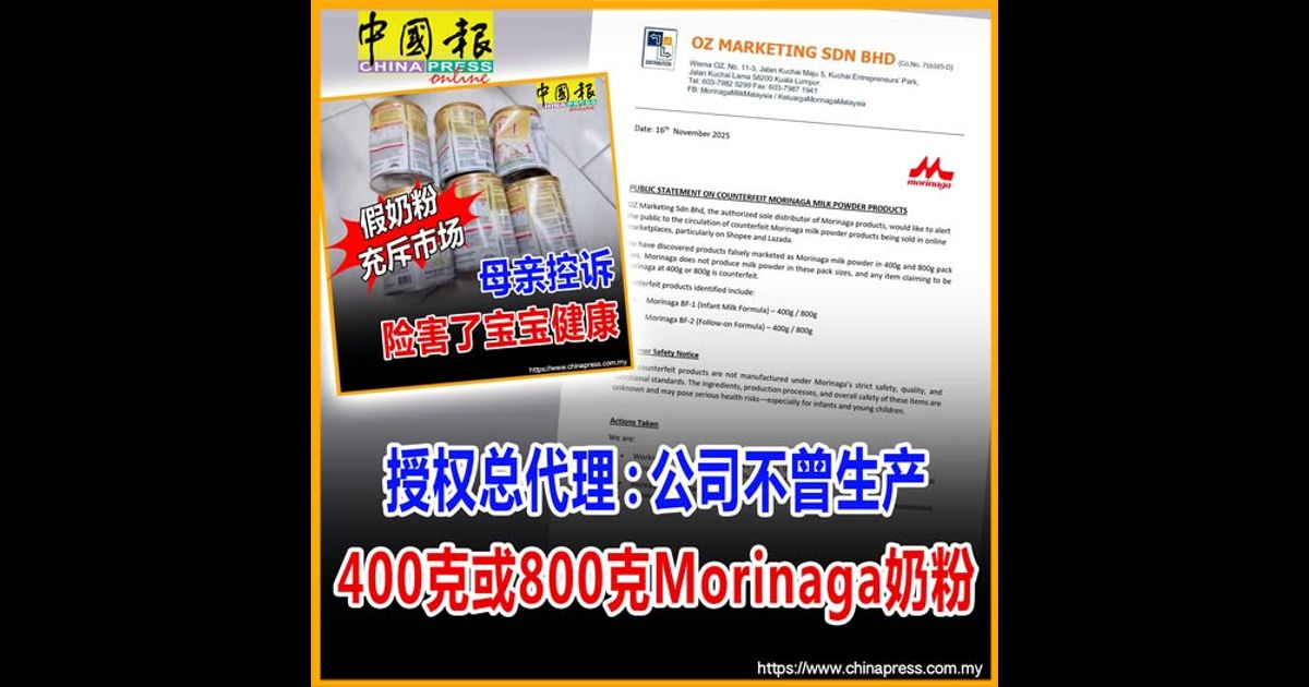 OZ Marketing私人有限公司于周一(11月17日)发布声明,该公司是Morinaga森永奶粉产品,在马来西亚的唯一授权总代理。