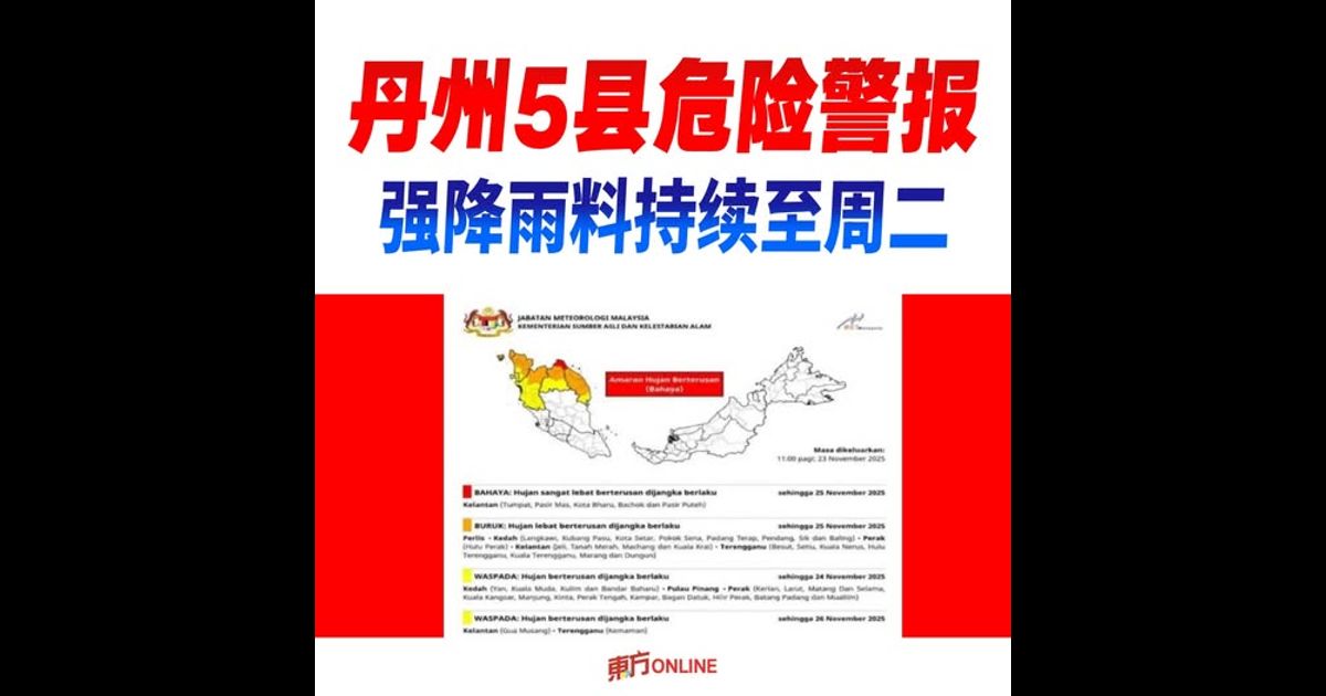 “此外,日里、丹那美拉、马樟和瓜拉吉赖(吉兰丹)以及勿述、士兆、瓜拉尼鲁斯、乌鲁登嘉楼、瓜拉登嘉楼、马江和龙运(登嘉楼)的暴雨警报也将持续到周二(11月25日)。”