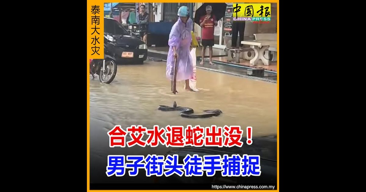 另一网友则上传合艾街道水位稍退的视频,画面中一只黑蛇在街头边潜行,一名戴着头盔、身穿雨衣的男子,左右手拿着塑胶袋和木棍与黑色对峙,试图将蛇制伏装入塑胶袋内。