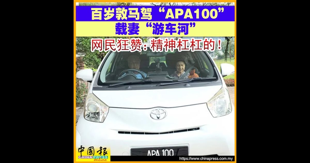 (吉隆坡22日讯)前首相敦马哈迪今年7月甫庆祝百岁生日,今日在社交媒体发布他开着车牌“APA100”的丰田轿车,载夫人敦西蒂哈丝玛“游车河”的照片,引起网友注意并狂赞!