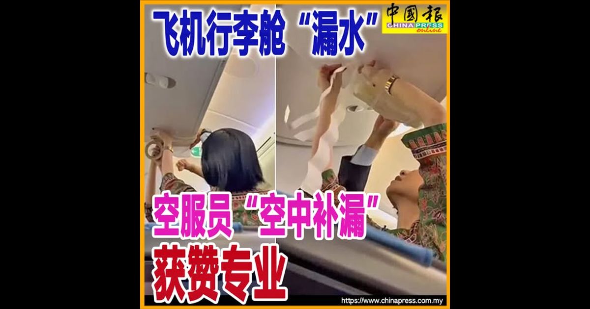 (新加坡22日讯)飞机行李舱“漏水”,新航空服人员使用胶带和毛巾封堵,专业态度获得乘客赞赏,后来发现是乘客放在行李舱的水瓶漏水所致。