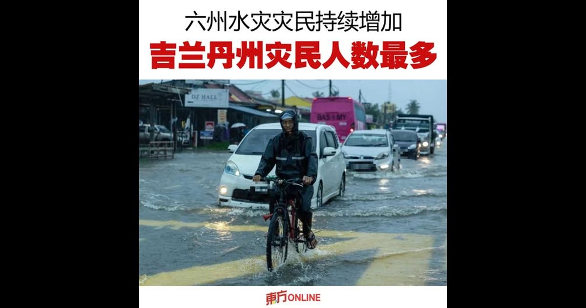 (吉隆坡23日讯)截至周日下午1点40分,西马半岛六州的水灾受灾人数持续增加至5053人,其中吉兰丹州被疏散至临时避难中心的人数最多。