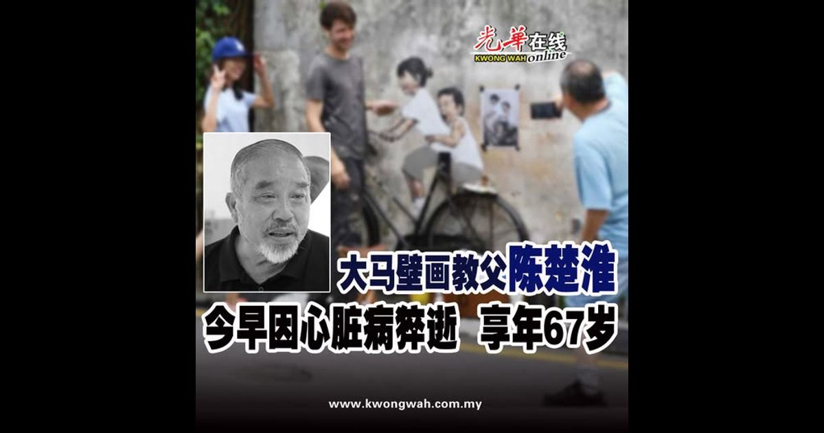 有“马来西亚壁画教父”之称的槟城肯肯公共艺术(Can Can Public Art)创办人陈楚淮,今早因心脏病猝逝,享年67岁。