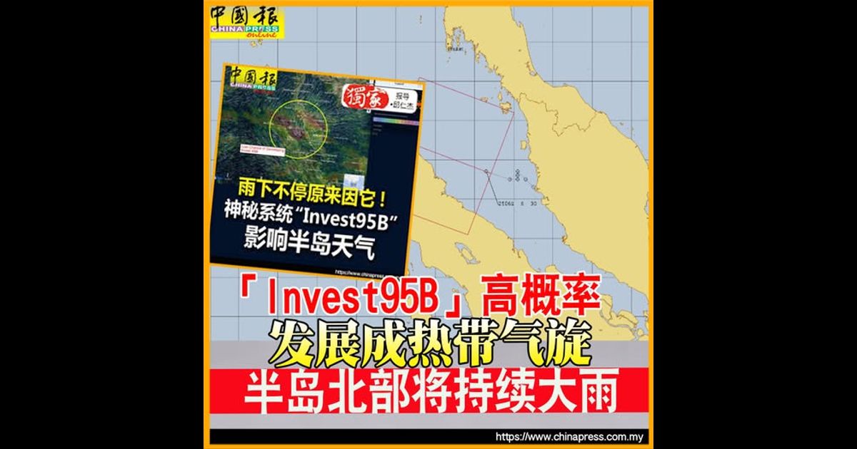 (吉隆坡25日讯)早前影响马来西亚半岛西部与北部大部分地区的扰动系统“Invest95B”,如今有高概率发展成热带气旋,此情况可在马来西亚半岛北部各州带来持续大雨、强风以及海况恶劣。
