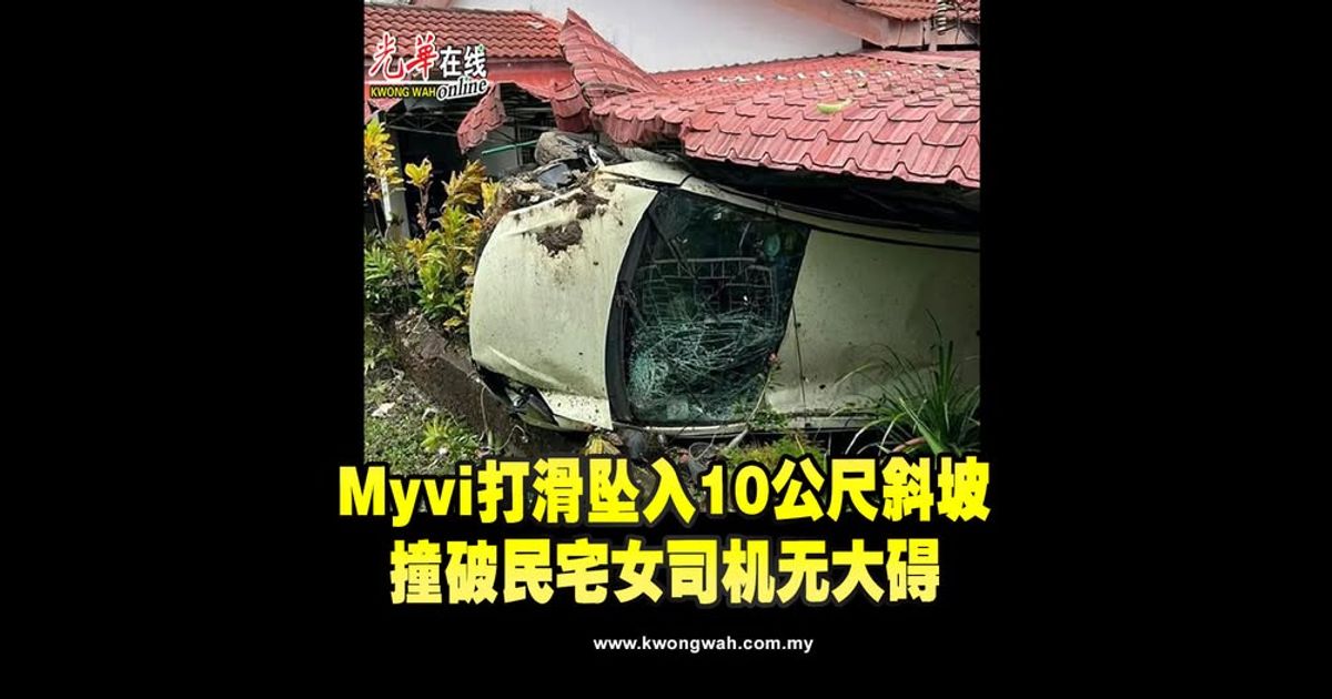 Myvi打滑坠入10公尺斜坡 撞破民宅女司机无大碍