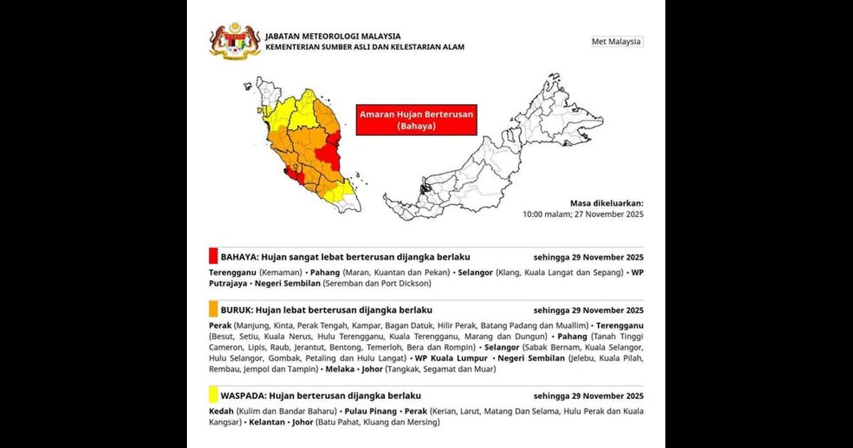 (吉隆坡27日讯)“Senyar”热带风暴将于明日(28日)凌晨时分登陆,气象局今晚10时发布“持续降雨警告”(危险),半岛各州皆进入持续降雨恶劣天气。