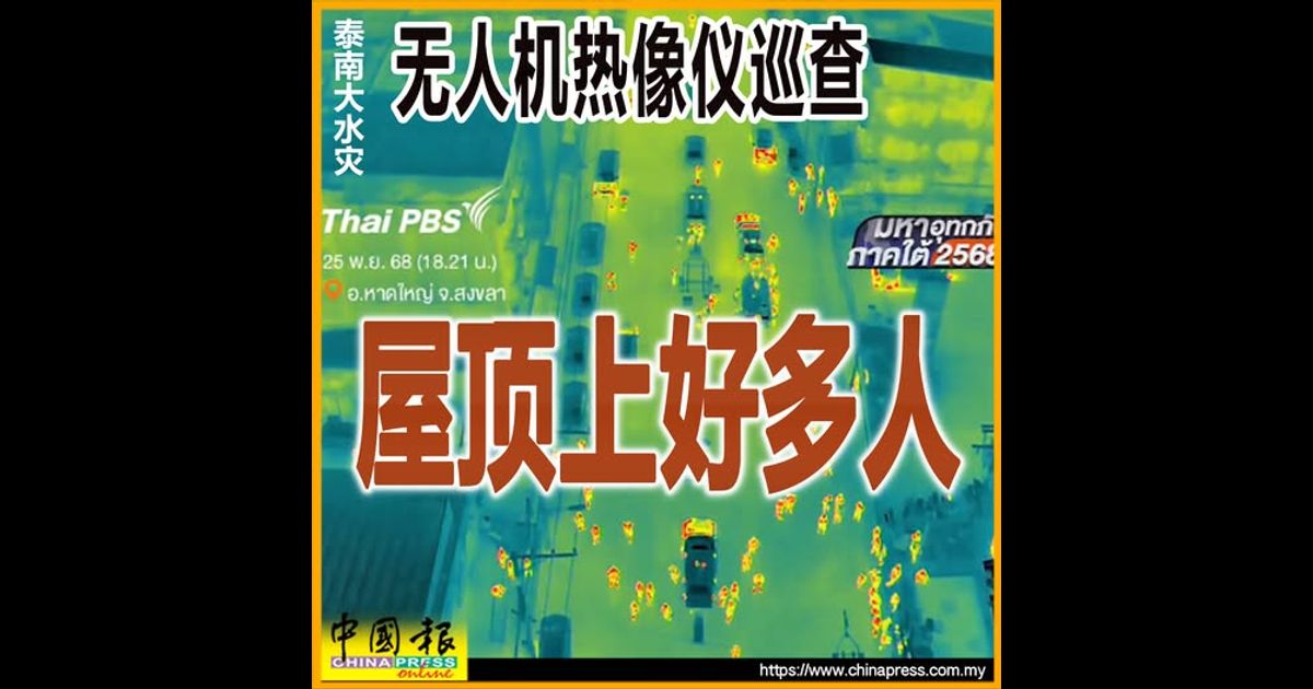 (曼谷26日综合电)泰南水灾灾情严峻,宋卡府特别是合艾,多个地区依旧水深及胸,救援行动面临重重阻碍。泰国电视台 PBS的制作团队在周二出动无人机,并开启热像仪模式巡查灾区,结果发现仍有大批民众被困在住宅、公寓及店屋等高楼层。