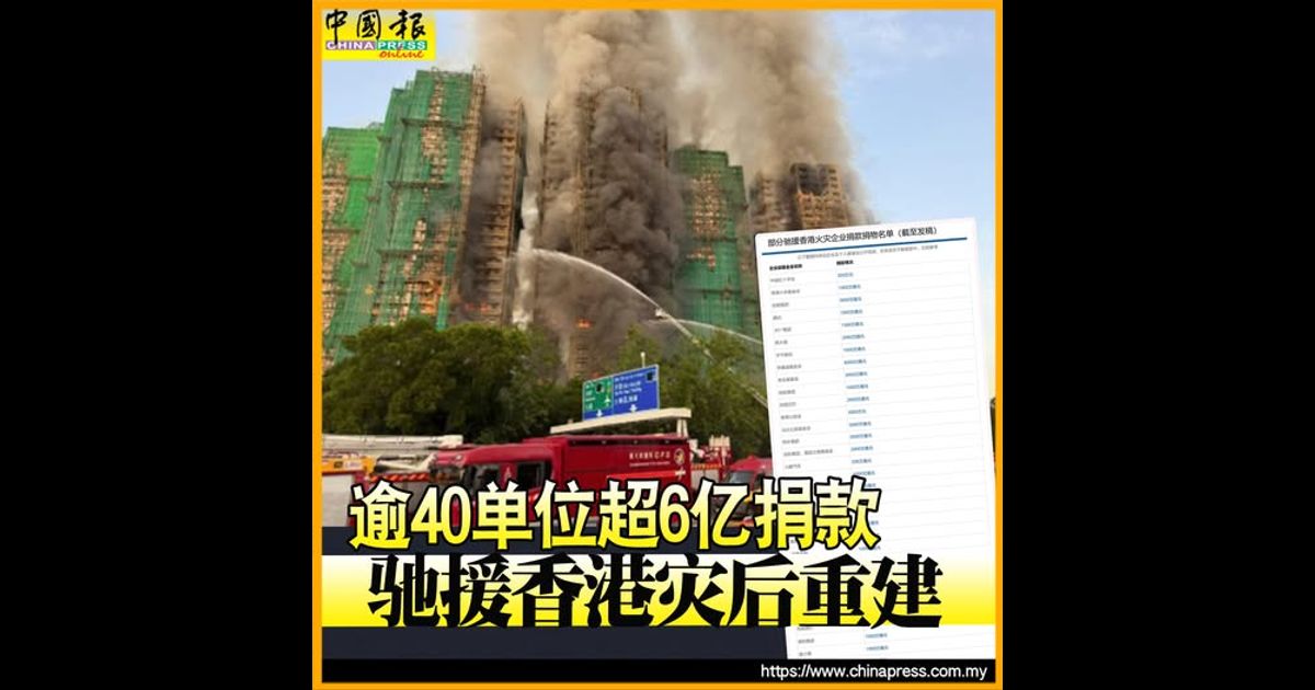 截至大马时间周四夜间8时,据媒体不完全统计,已有40多家企业、基金会及知名人士纷纷向香港捐款捐物,合计捐款金额超6亿港元(约3.19亿令吉),助力救援与灾后重建。