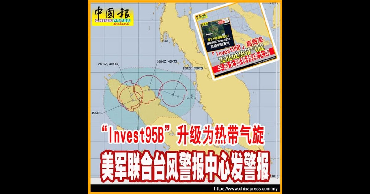 (吉隆坡26日讯)根据美军联合台风警报中心(JTWC)分析,早前影响马来西亚半岛西部与北部大部分地区的扰动系统“Invest95B”,已经升级为热带气旋,该中心正式发出“热带气旋 04B”警报。