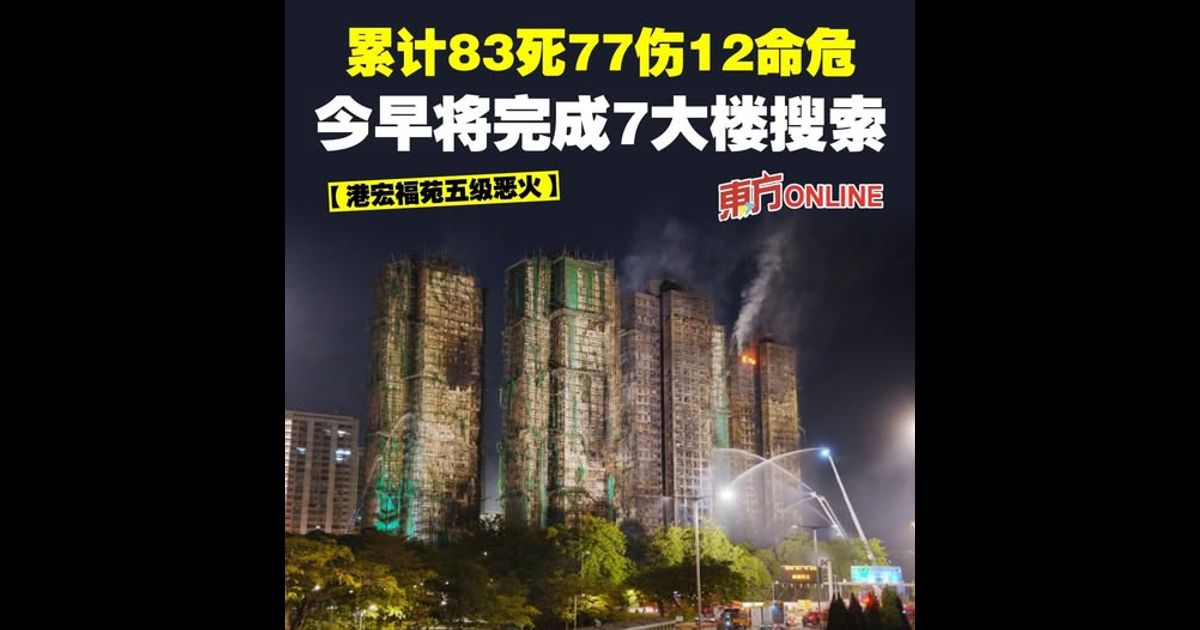 (香港28日讯)香港新界大埔宏福苑大火,截至今日(28日)凌晨,已知造成至少83人死亡、77人受伤、12人命危。当地消防表示,目前灭火行动已经大致完成,预计今日早上9点完成7大楼爆破。