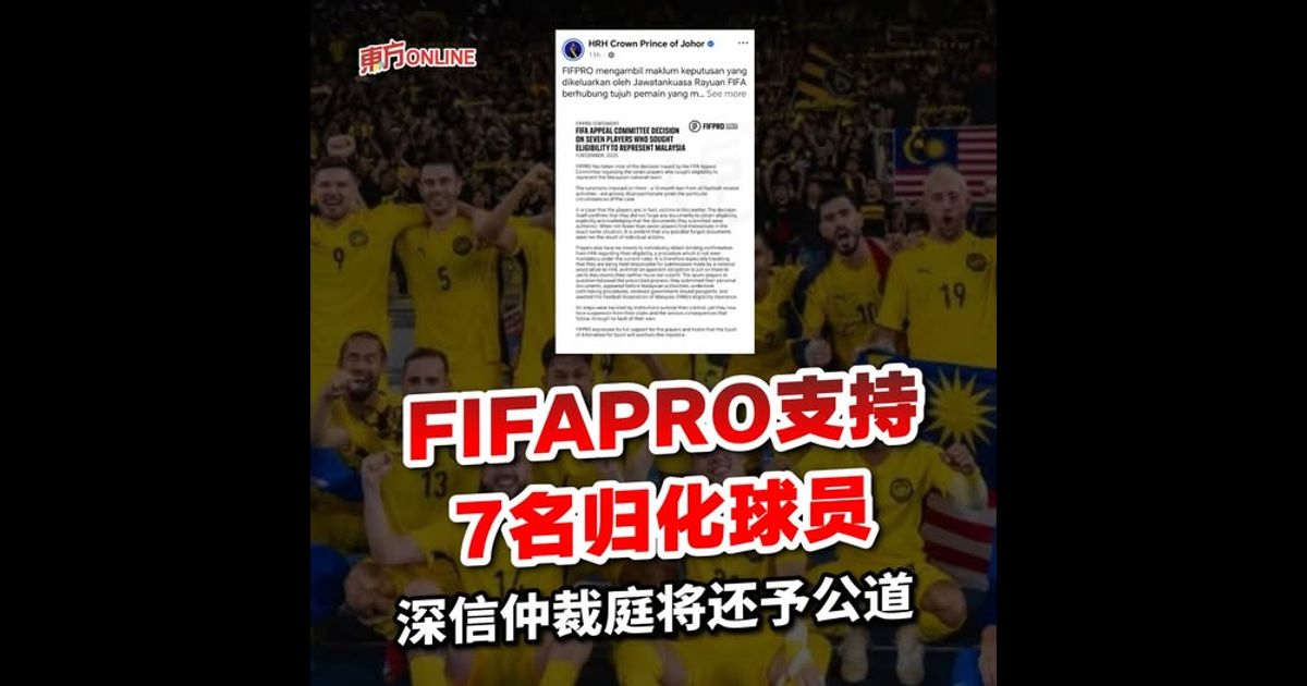 (新山2日讯)柔佛摄政王东姑依斯迈在社交媒体转发国际职业足球员协会(FIFPRO)声明,该会强烈谴责国际足总(FIFA)对7名大马归化球员作出的禁赛决定,并相信国际体育仲裁庭将作出正确的裁决。