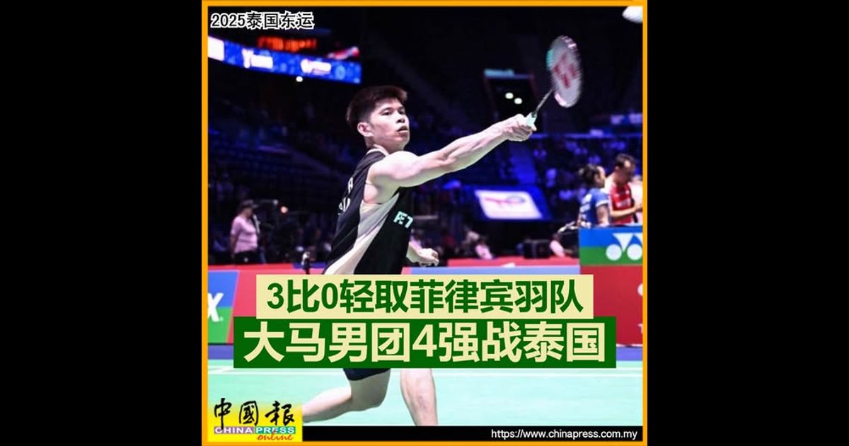 第33届东运会羽球男团8强赛今日下午进行,凭借第一男单梁峻豪、第一男双万炜聪与苏伟译、以及第二男单贺首维取胜,大马最终以3比0轻取菲律宾队,勇闯半决赛,明日与东道主泰国争夺决赛门票。