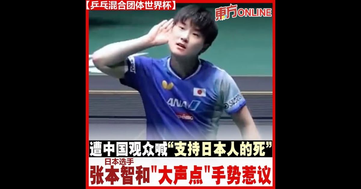 【乒乓混合团体世界杯】遭中国观众喊“支持日本人的死” 张本智和“大声点”手势惹议