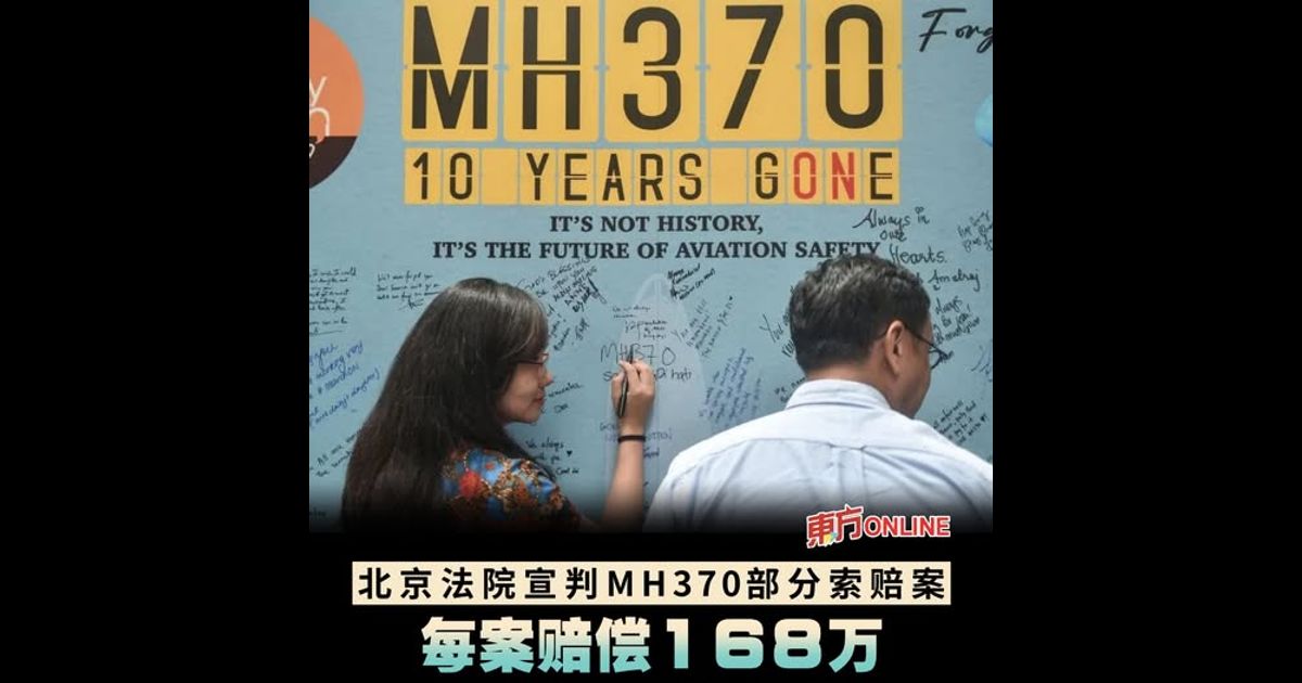 (北京8日讯)中国北京法院上周对马航MH370航班部分失联乘客家属索赔案一审宣判,判令马来西亚航空公司和马来西亚国际航空有限公司就每案赔偿乘客家属死亡赔偿金、丧葬费、精神损害抚慰金及其他损失和相关费用共计290馀万元人民币(约168万5000令吉)。