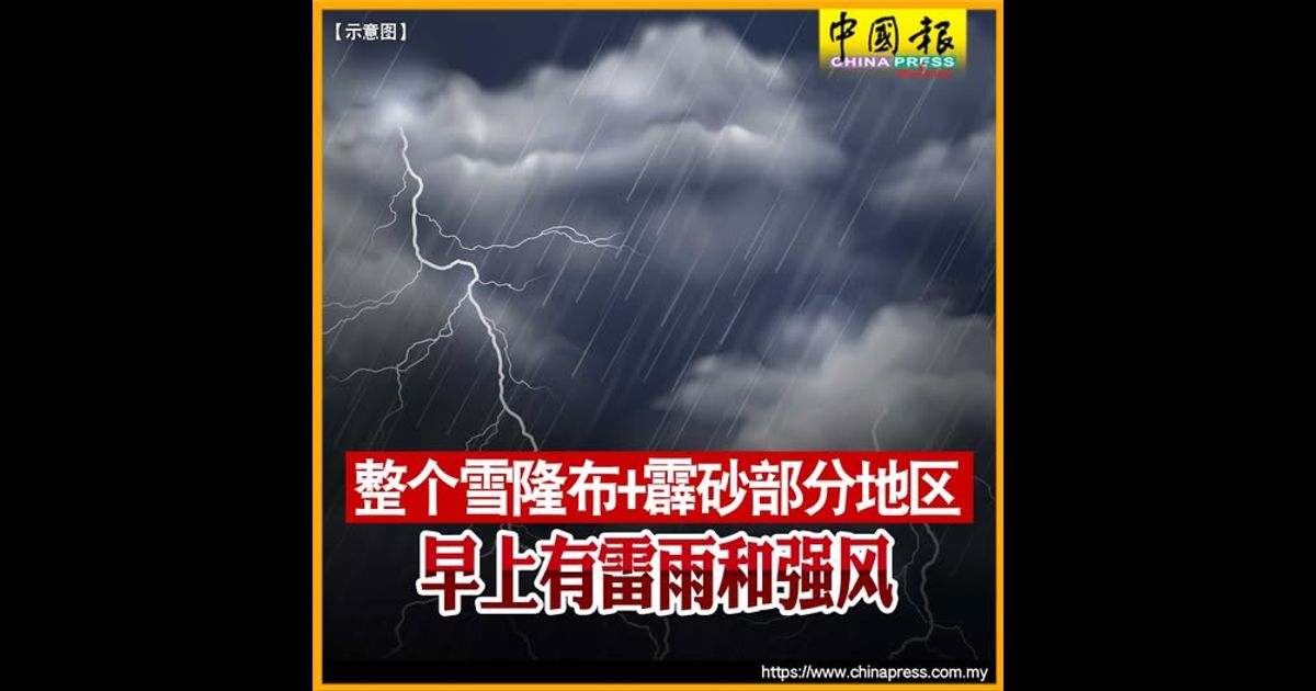 (吉隆坡8日讯)气象局预测,半岛与砂拉越部分地区将有雷雨和强风,料持续到早上9时。