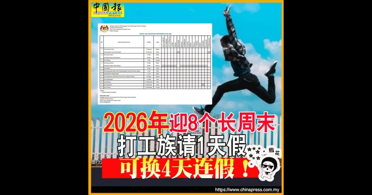(吉隆坡8日讯)2026年有多个公共假期与周末相连或正好落在周末,国人料迎来8个包含补假在内的连假,打工仔也可通过合理规划年假享受更长假期,例如请假一天,就有4天或以上连假。