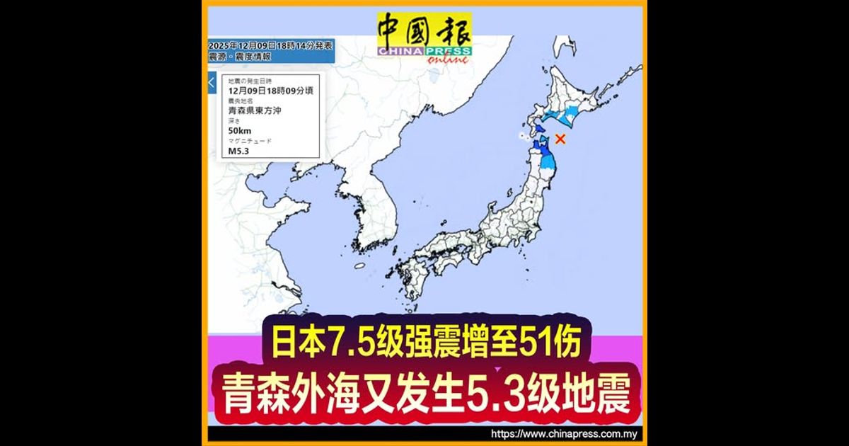 (东京9日综合电)日本青森县东方外海周一(8日)深夜发生7.5强震后,截至周二(9日)午后,受伤人数已增至51人。而周二傍晚6时09分(大马时间周二下午5时09分)又发生5.3级地震,震源深度约50公里,最大震度3,北海道与东北多地明显摇晃。所幸气象厅表示,这起地震不会引发海啸。