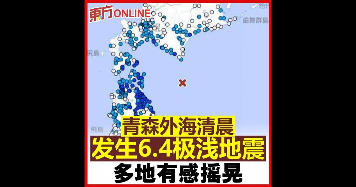 (东京9日讯)日本今晨再度传出发生有感地震。日本时间9日清早6时52分(大马时间5时52分),青森县外海发生规模6.4的极浅层地震,震源深度仅10公里,属于前一晚强震后的馀震。青森县与岩手县多处有感,部分地区观测到震度4。