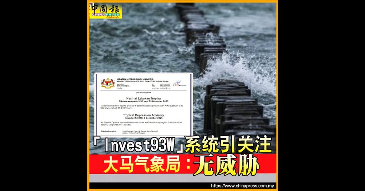(吉隆坡9日讯)一个在数日前被标示为“Invest93W”扰动区的移动轨迹,最近在社交媒体引发关注,有网民议论其有可能会对西马半岛带来影响,但气象部门及国际机构均指出,该系统已不构成威胁。