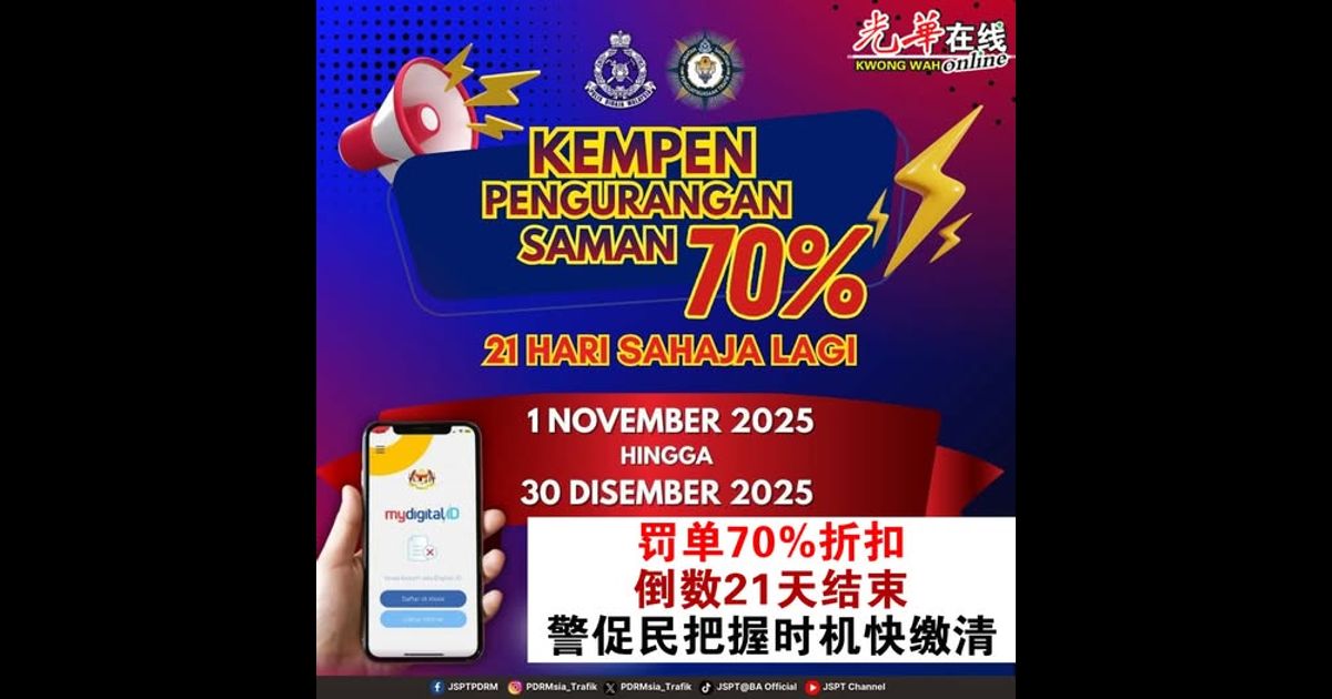 自11月起,陆交局(JPJ)和警方提供50%至70%的罚单折扣,鼓励车主缴纳长期拖欠的罚款,该优惠将于12月31日结束。