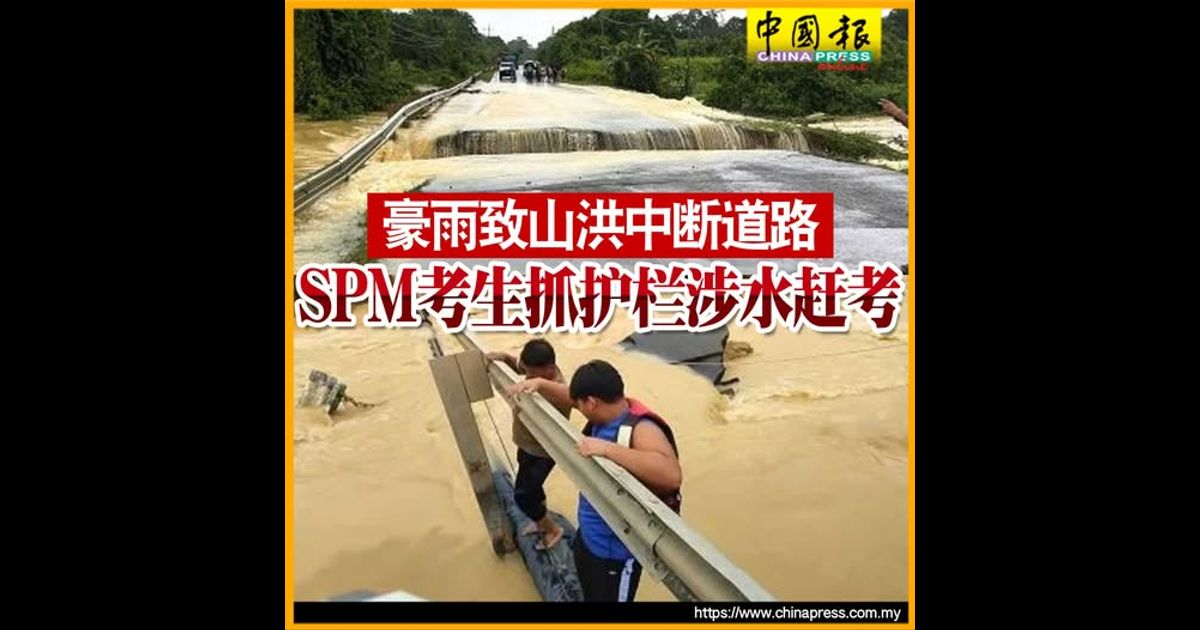 其中受灾最严重的地区,是在乌西尔长屋附近,约20尺宽的道路被山洪冲断,造成一名SPM考生为了赶赴考场,在家人陪同下,冒险紧抓护栏,缓慢越过洪水,过程险象环生。