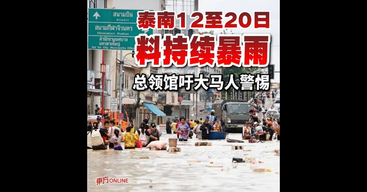 (吉隆坡13日讯)马来西亚驻泰国宋卡总领事馆指出,根据气象预测,泰国南部将于本月12日至20日期间遭遇持续性强降雨,恐引发突发性洪水。
