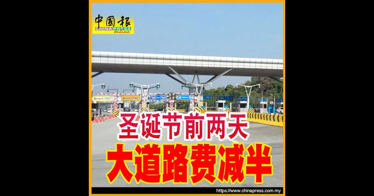 (吉隆坡19日讯)工程部长拿督斯里阿历山大南达林奇宣布,配合来临的圣诞节,政府已同意周二(23日)和周三(24日,圣诞节前夕),于全国大道收费站落实50%过路费折扣,为期两天,以减轻民众返乡过节的负担。
