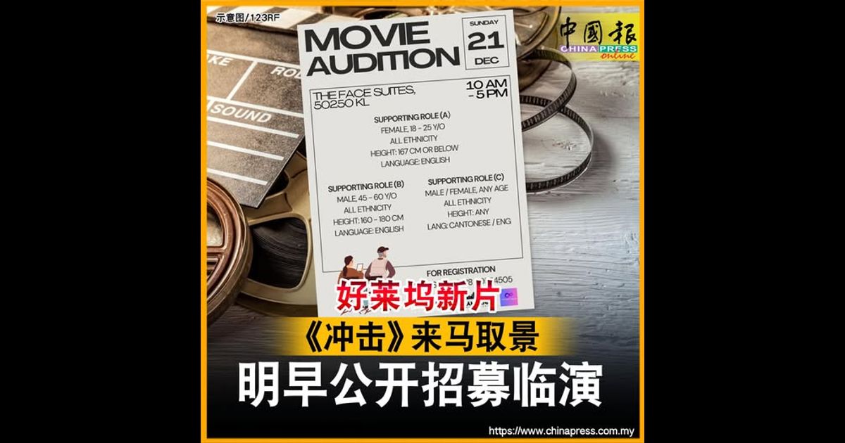 (吉隆坡20日讯)继漫威电影《雷霆特工队》后,好莱坞新片《冲击》将在大马取景拍摄,主创团队将于明早(21日)上午10时至下午5时,在The Face Suites Platinum Hall 50A楼招聘临演!