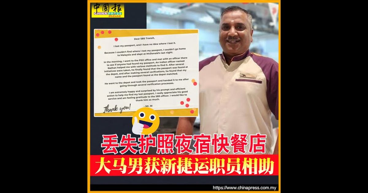 (新加坡22日讯)大马男子搭巴士时丢失护照无法回国,搞到要在快餐店过夜,隔天求助新捷运职员后成功寻回护照,并致函感谢职员伸出援手。