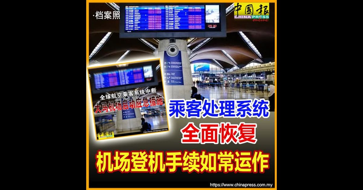 (吉隆坡23日讯)大马机场控股公司(MAHB)指出,全球多家航空公司使用的乘客处理系统已全面恢复,各机场的办理登机手续工作已恢复正常运作。