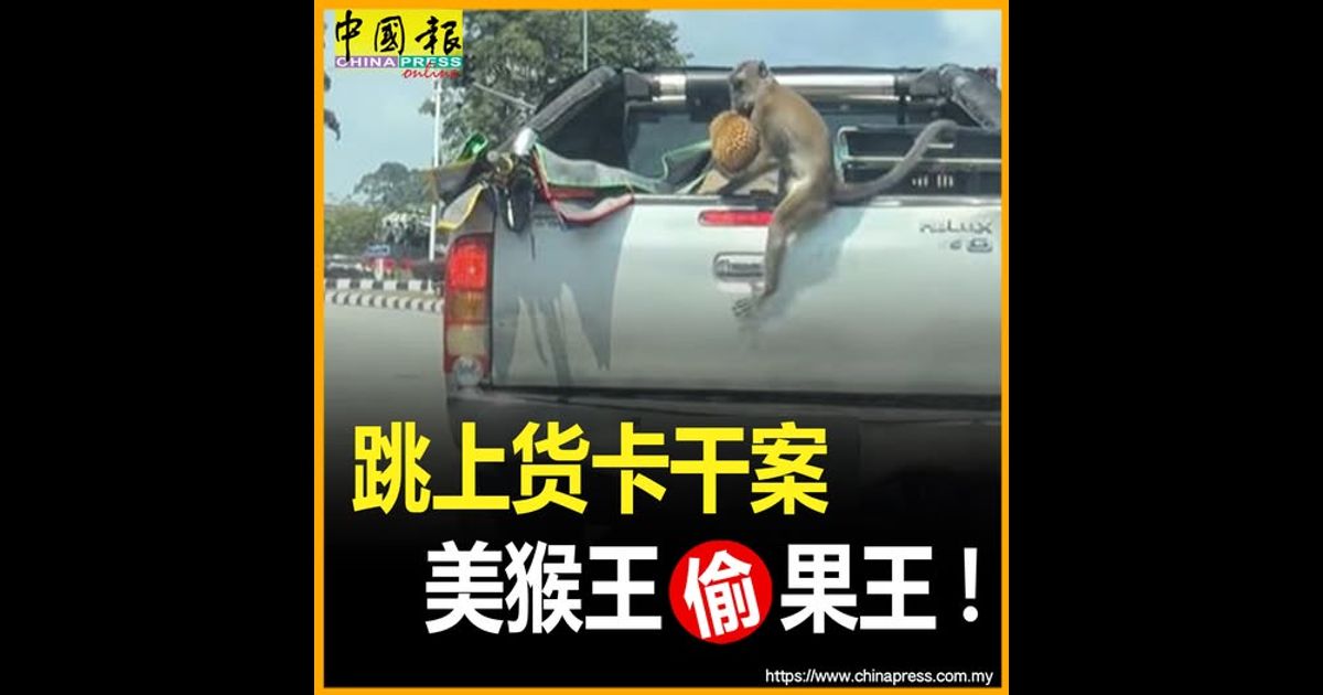 一只识货的猴子,为了“果王”榴梿,竟在红绿灯前大胆出手,跳上一辆停等的货卡,在众目睽睽下“抱果而逃”。
