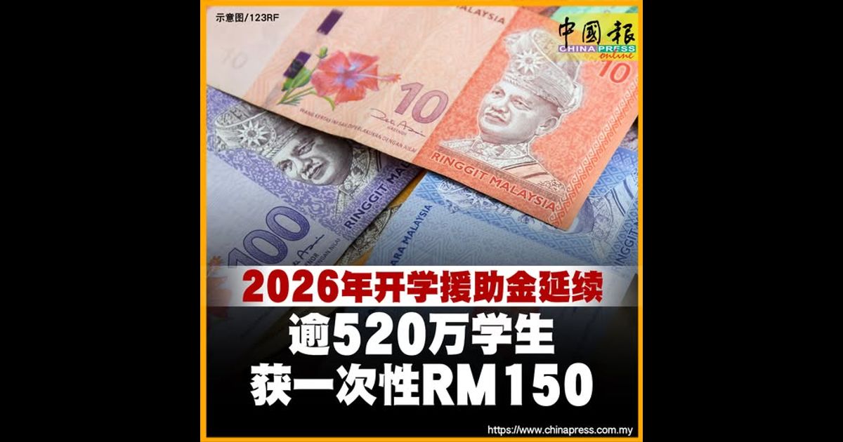 (吉隆坡23日讯)2026年开学援助金政策延续进行,逾520万学生最早从明年1月开始将获一次性150令吉的开学援助金。