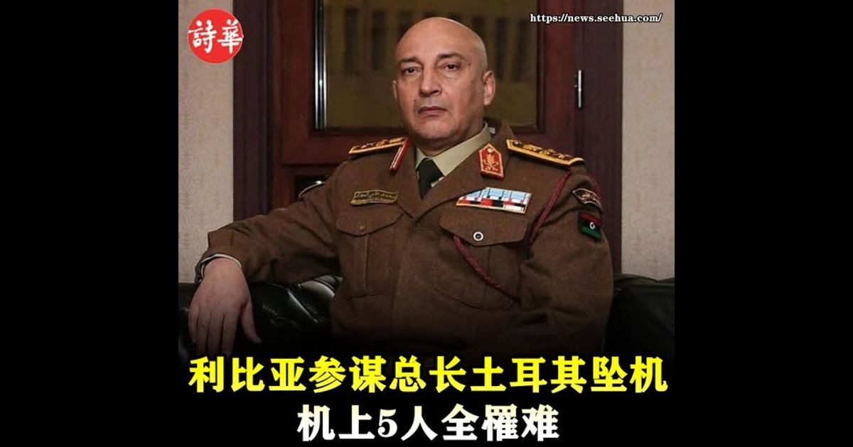 利比亚参谋总长哈达德(Mohammed al-Haddad)中将与其他4名同行者,今日自土耳其首都安卡拉搭乘商务喷射机离境,没想到飞机起飞不久即在安卡拉附近坠毁,机上无人生还。事发后,土耳其与利比亚官方均证实此意外,双方都表达了哀悼之意。