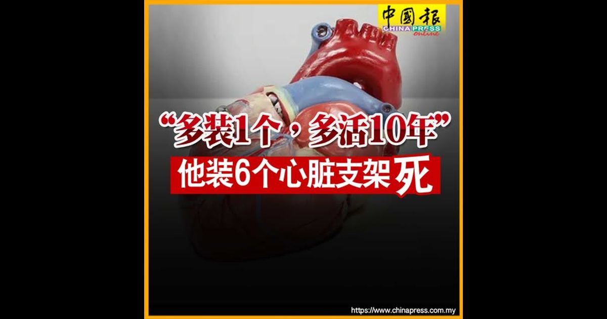 (北京25日综合电)中国吉林省舒兰市一名42岁陈姓男子,听了医师的话说“多装一个心脏支架可以多活10年”,于是月前一次性植入6个心脏支架,想不到术后半小时就发生心脏骤停,抢救8天后仍宣告不治。