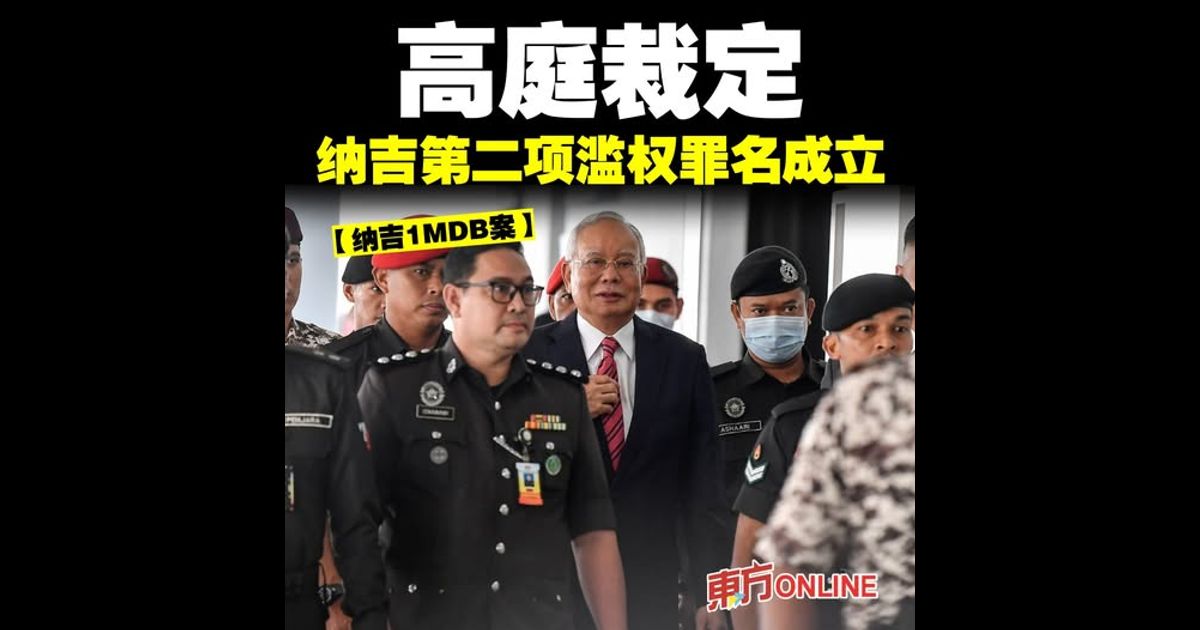 (布城26日讯)前首相拿督斯里纳吉涉及的一马公司案今日下判,承审法官拿督柯林劳伦斯裁定,纳吉第二项滥权罪成立。