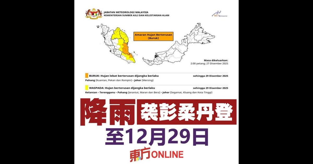 (吉隆坡27日讯)大马气象局发布预警,彭亨、柔佛、吉兰丹和登嘉楼将持续降雨直至周一(12月29日)。