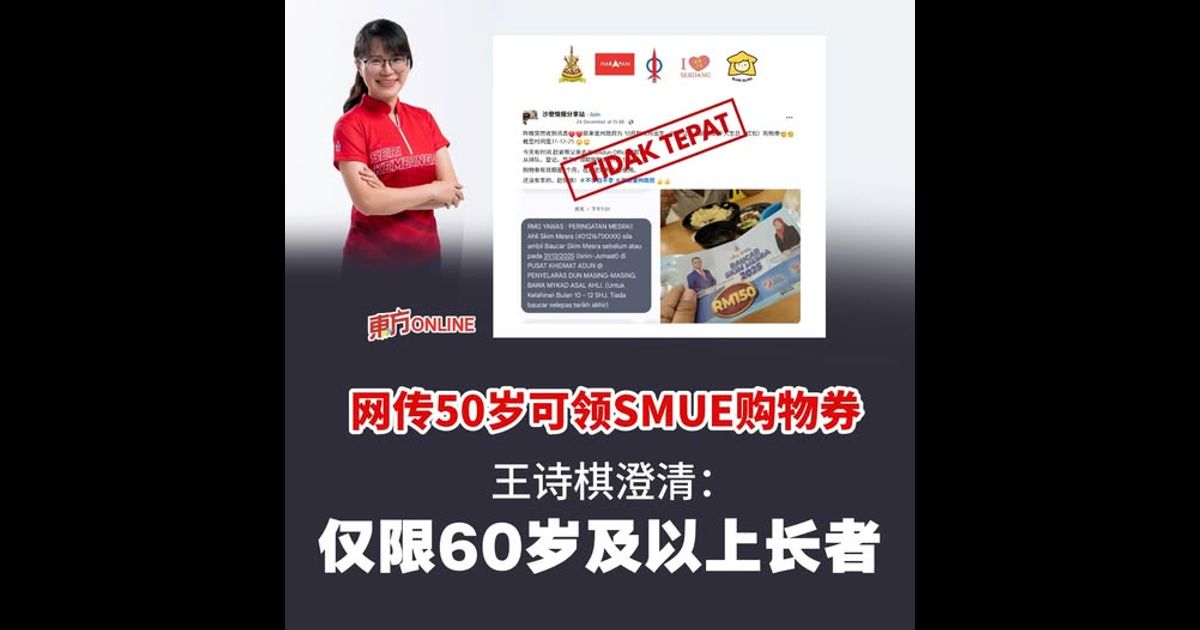 (吉隆坡28日讯)针对近日网络流传指“50岁以上的雪州选民可领取150令吉购物券”的说法,史里肯邦安州议员王诗棋澄清,雪州亲善乐龄基金(SMUE)仅开放予60岁及以上的雪州选民申请成为会员,并非网传的50岁以上。