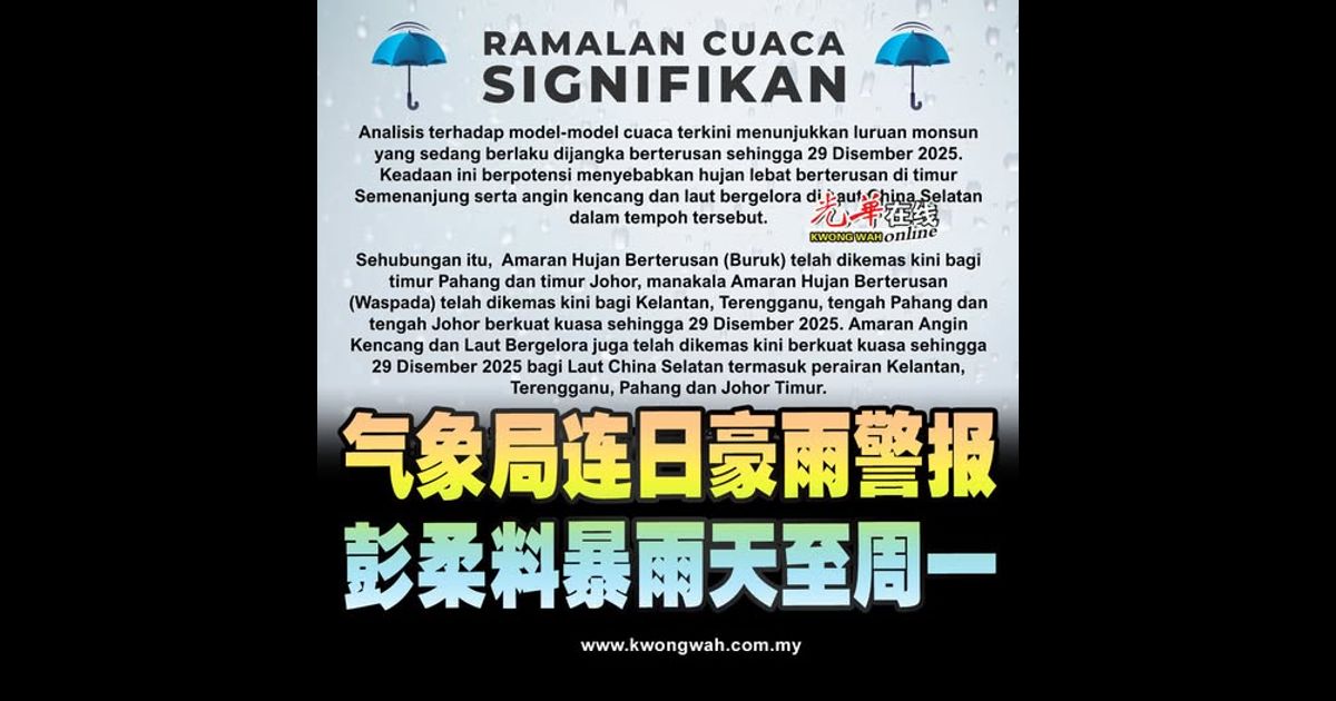 我国气象局发出连续豪雨警报,半岛彭亨及柔佛两个州属的多个地区,将从周六(12月27日)起迎来暴雨,直至下周一(12月29日)为止。
