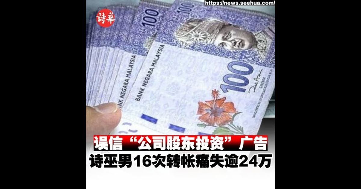 (诗巫28日讯)一名50余岁在职华裔男子误信社交媒体上的“公司股东投资”广告,坠入投资骗局,在短短不到两个月内16次转帐,损失高达24万1250令吉。