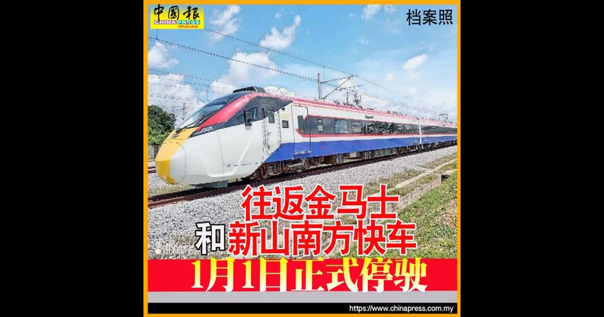 (吉隆坡29日讯)马来亚铁道公司(KTMB)宣布,往返金马士和新山中环车站的南方快车路线,将于2026年1月1日起正式停驶,结束长达9年的营运。