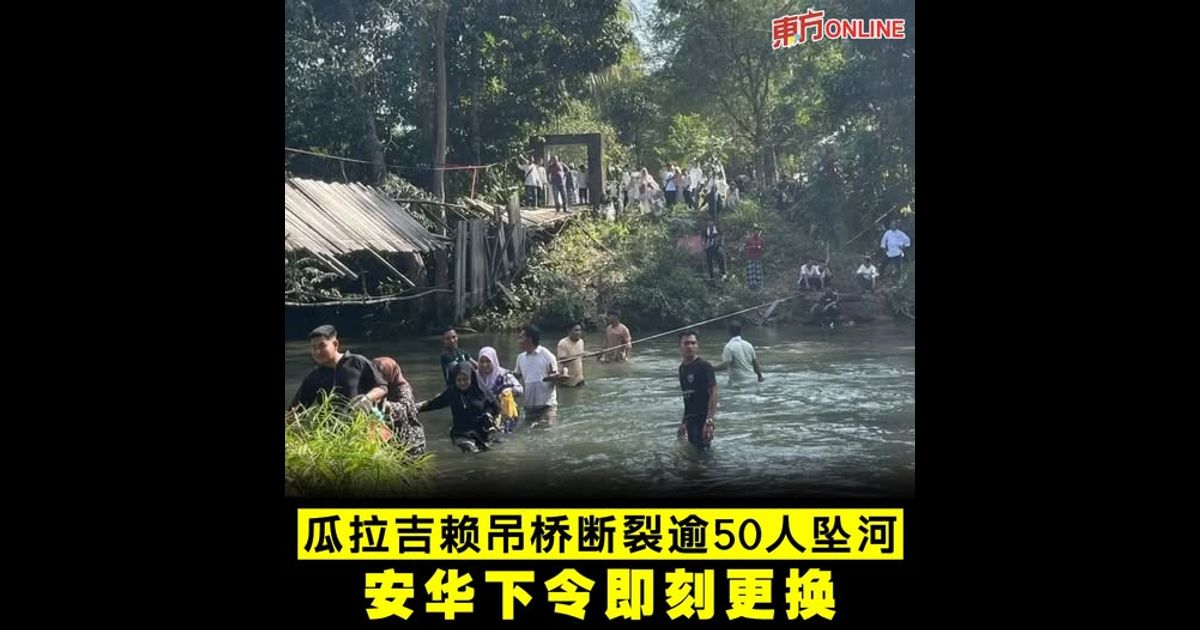 昨日下午,吉兰丹瓜拉吉赖拉达利因一座吊桥突然断裂,导致逾50名宾客跌入河中,数人受伤。