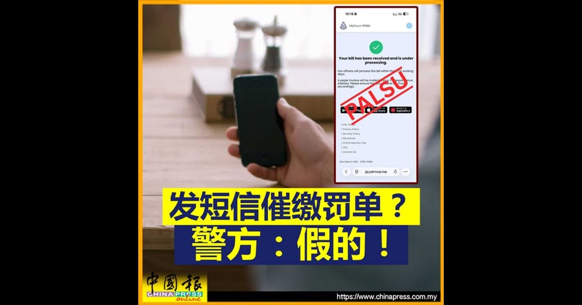(吉隆坡3日讯)武吉阿曼交通调查与执法局,亲自发短信催缴罚单?假的!