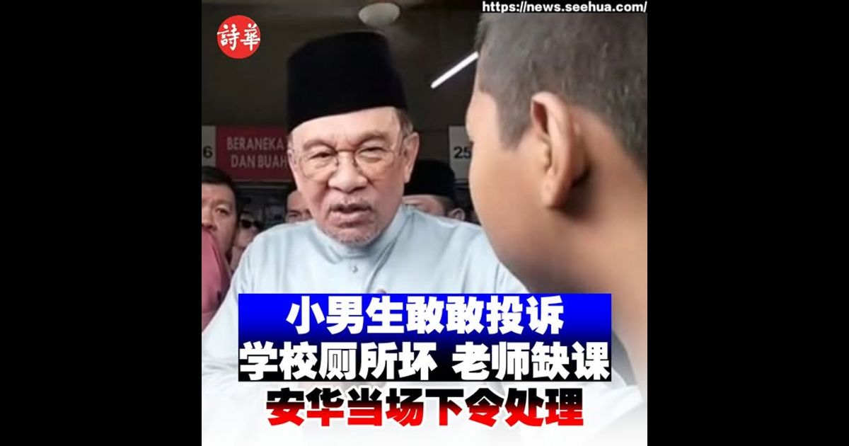 (吉隆坡2日讯)一名国小生主动向首相拿督斯里安华投诉学校厕所损坏、阿拉伯语老师经常缺课的问题。