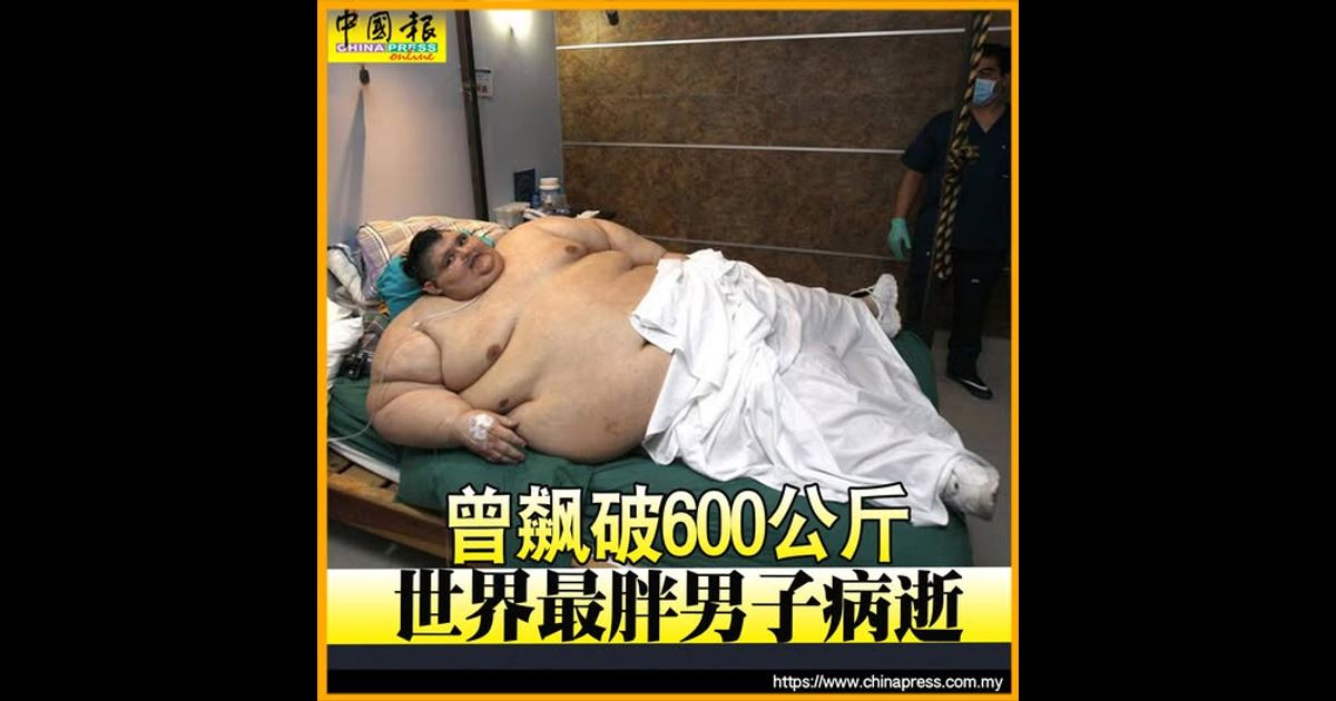 (墨西哥城4日综合电)曾被健力士世界纪录认定为“世界最胖男子”的墨西哥人佛兰克,因肾脏感染引发全身系统性并发症不幸去世,终年41岁。 他巅峰时期体重高达600公斤,因肾脏感染引发严重并发症,在医院治疗期间,于去年12月24日病情急转直下,不幸离世。