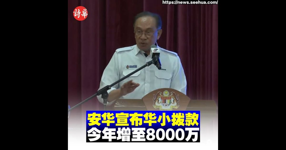 (布城5日讯) 首相拿督斯里安华今日宣布,今年华小的拨款从原本的5000万令吉增加至8000万令吉。