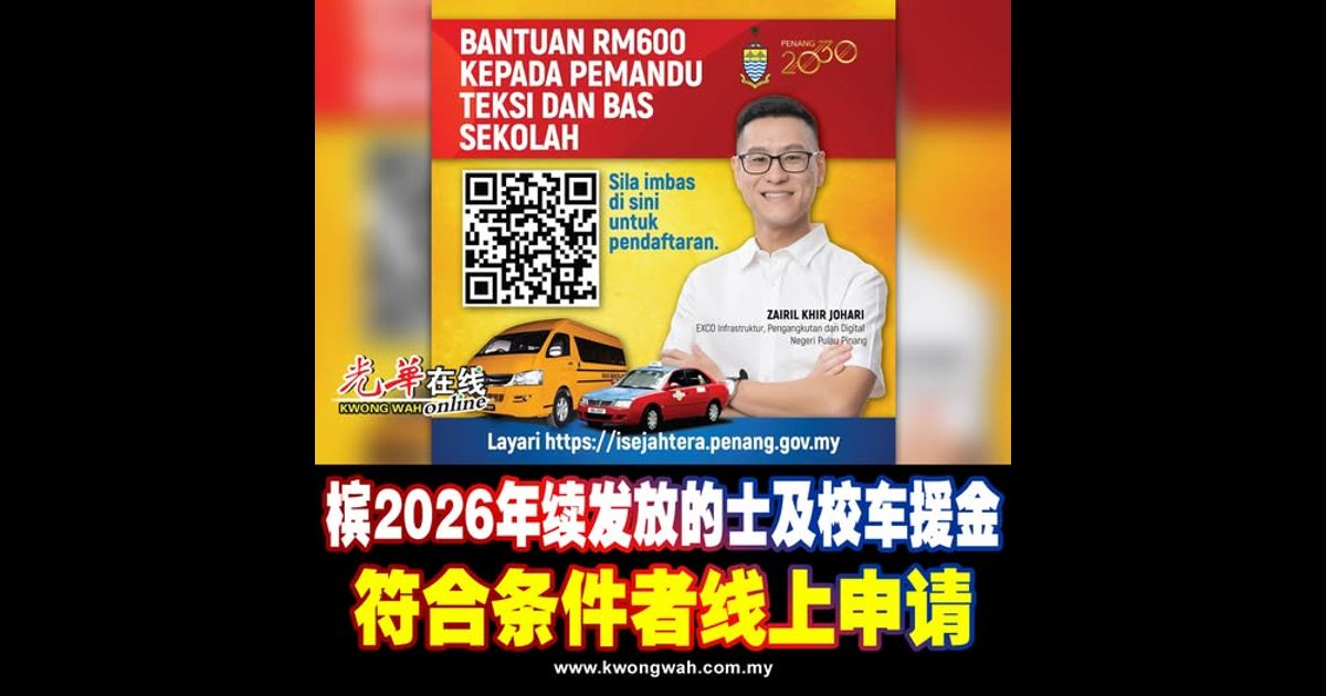 槟州基设、交通及数字委员会主席再里尔指出,槟州政府将于2026年继续发放的士司机及校车业者援助金,每名合资格者可获一次性600令吉现金援助。