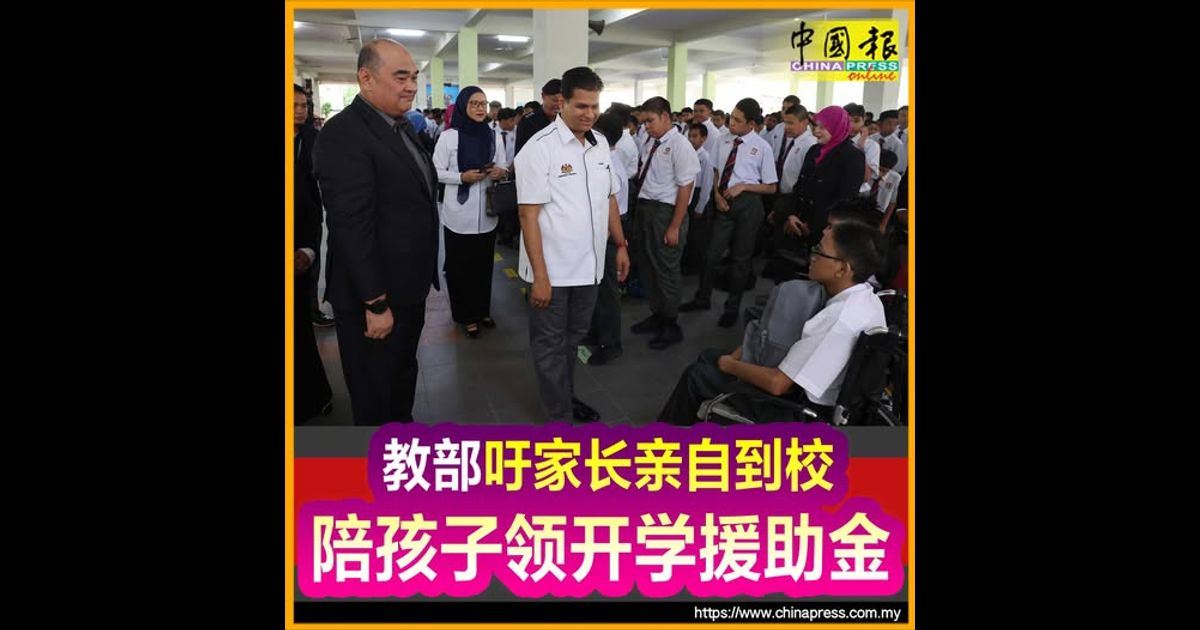 (布城12日讯)教育部鼓励家长,在这周派发开学援助金(BAP)期间,亲自到校陪同孩子和见证,确保了解整个派发流程,及核实孩子是否收到正确数额的援助金。