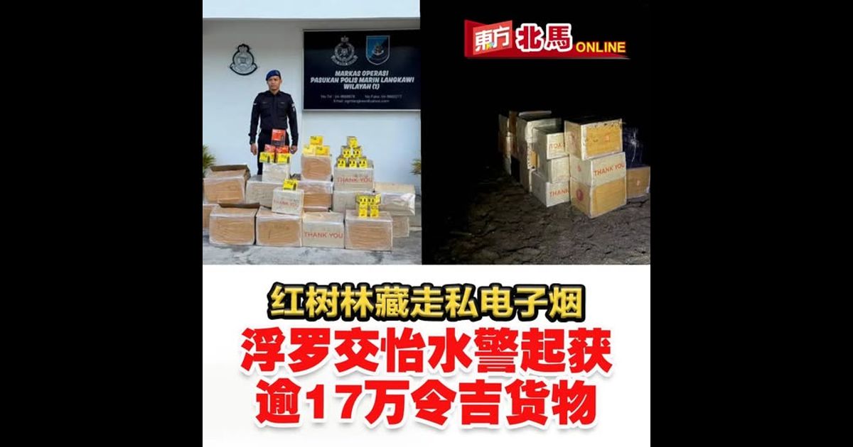 “当巡逻队行至甘榜艾娃(Kampung Ewa)附近的红树林支流时,发现多个可疑纸箱,经检查后证实有多款不同品牌与口味的电子烟装置与烟油,初步估值达17万8400令吉。”